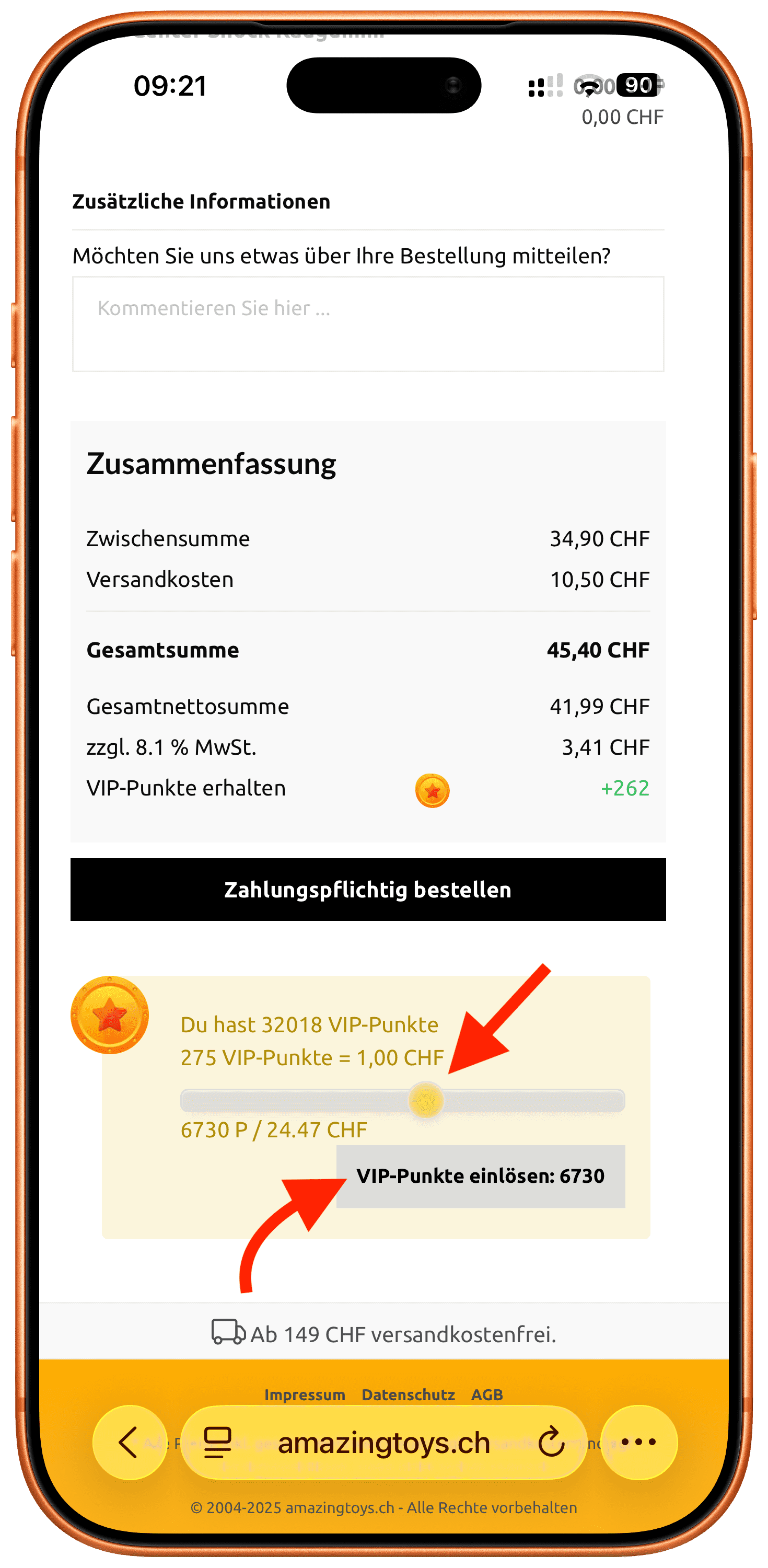 2. Im Checkout ganz unten kannst du deine Punkte mit dem Regler einlösen.