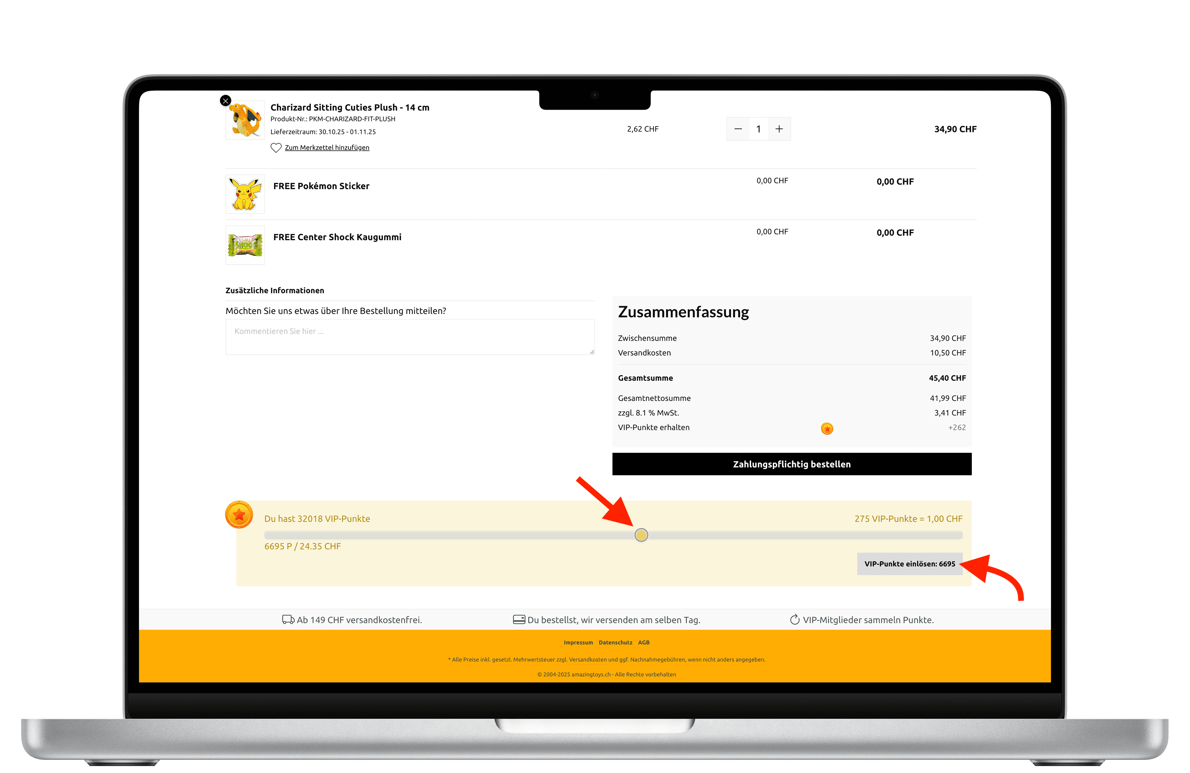 VIP-Punkte sind ausschliesslich im Online-Shop einlösbar und können nicht bar ausbezahlt werden.